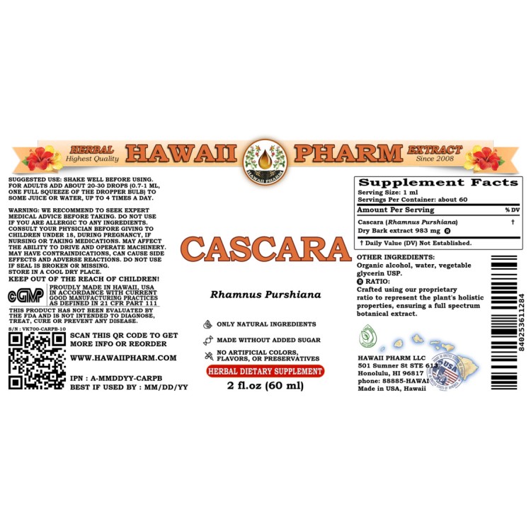 Main Ingredients: Wild harvested Cascara (Rhamnus Purshiana) dried bark. Origin: USA.