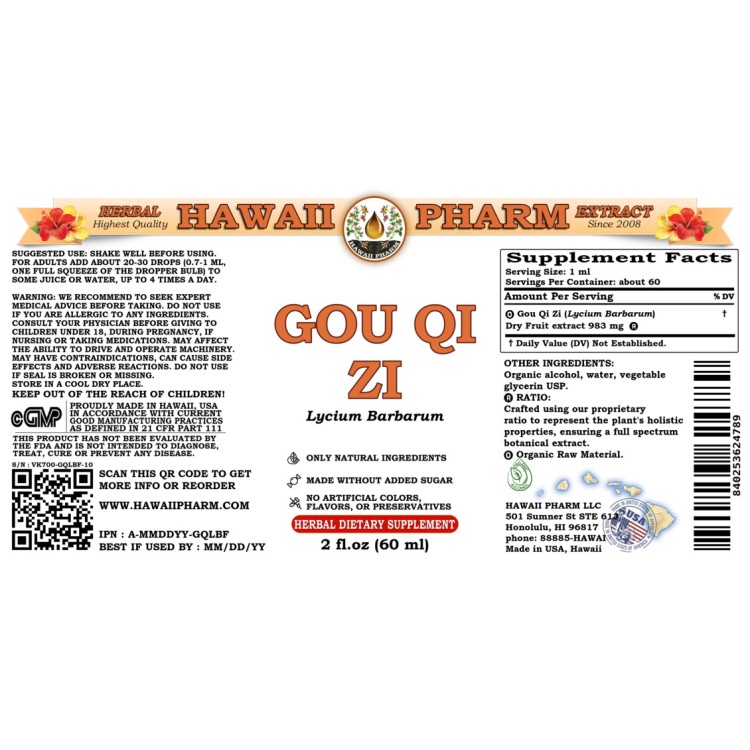 Main ingredient: Gou Qi Zi (Lycium Barbarum) Dry fruit. Origin: Nepal. Menstruum: Alcohol, vegetable glycerin, crystal clear water. Contains NO: GMO, gluten, artificial colors, heavy metals, preservatives, pesticides, fertilizers.