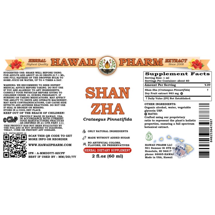 Main ingredient: Shan Zha (Crataegus Pinnatifida) Dry fruit. Origin: Thailand. Menstruum: Alcohol, vegetable glycerin, crystal clear water. Contains NO: GMO, gluten, artificial colors, heavy metals, preservatives, pesticides, fertilizers.