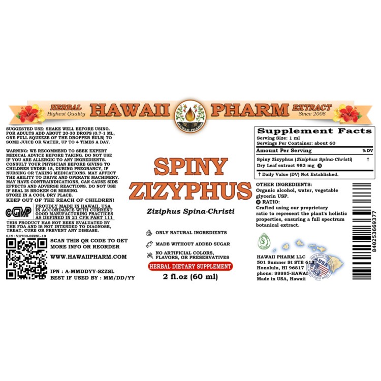 Main ingredient: Spiny Zizyphus (Ziziphus Spina-Christi) Dry leaf. Origin: India. Menstruum: Alcohol, vegetable glycerin, crystal clear water. Contains NO: GMO, gluten, artificial colors, heavy metals, preservatives, pesticides, fertilizers.