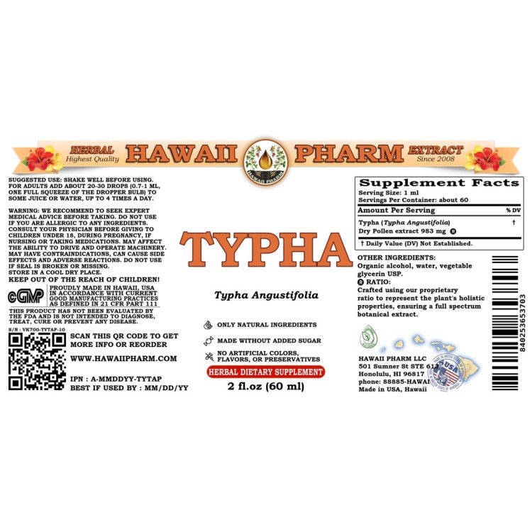 Main ingredient: Typha (Typha Angustifolia) Dry pollen. Origin: Thailand. Menstruum: Alcohol, vegetable glycerin, crystal clear water. Contains NO: GMO, gluten, artificial colors, heavy metals, preservatives, pesticides, fertilizers.