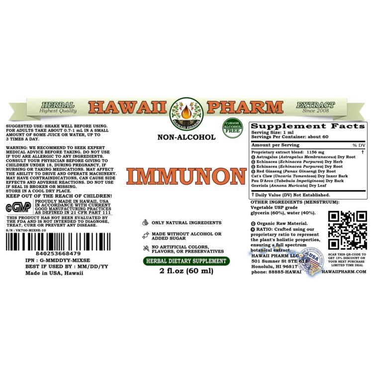 Immunon - Hawaii Pharm Absolutely Natural Premium Quality ALCOHOL-FREE Liquid Extract Herbal Supplement