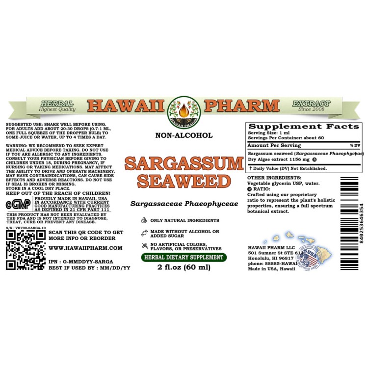 Main ingredient: Sargassum Seaweed (Sargassaceae Phaeophyceae) Dry Algae. Menstruum: Alcohol, vegetable glycerin, crystal clear water. Contains NO: GMO, gluten, artificial colors.