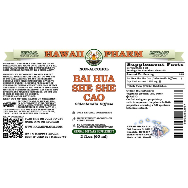 Main ingredient: Bai Hua She She Cao (Oldenlandia Diffusa) Dry Herb. Origin: China. Menstruum: Alcohol, vegetable glycerin, crystal clear water. Contains NO: GMO, gluten, artificial colors.