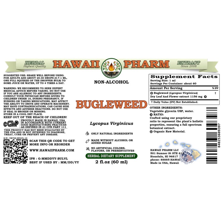 - Expertly extracted Bugleweed (Lycopus Virginicus) ALCOHOL-FREE liquid extract!