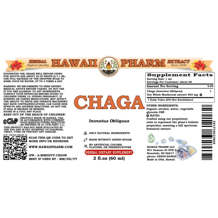 We stand behind the quality of our Chaga (Inonotus Obliquus) Dry Whole Mushroom Tincture with our satisfaction guarantee. Each bottle contains the pure essence of organic botanical ingredients, expertly extracted without preservatives or synthetic additives.
