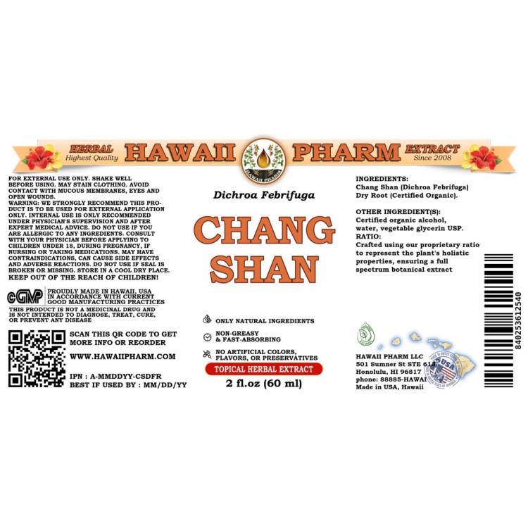 Main ingredient: Chang Shan (Dichroa Febrifuga) Dry root. Origin: Thailand. Menstruum: Alcohol, vegetable glycerin, crystal clear water. Contains NO: GMO, gluten, artificial colors, heavy metals, preservatives, pesticides, fertilizers.