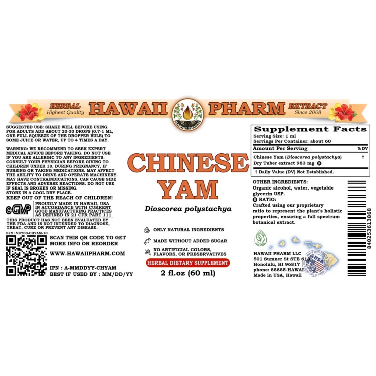 Main ingredient: Chinese Yam (Dioscorea Polystachya) Dry Tuber. Origin: China. Menstruum: Alcohol, vegetable glycerin, crystal clear water. Contains NO: GMO, gluten, artificial colors.