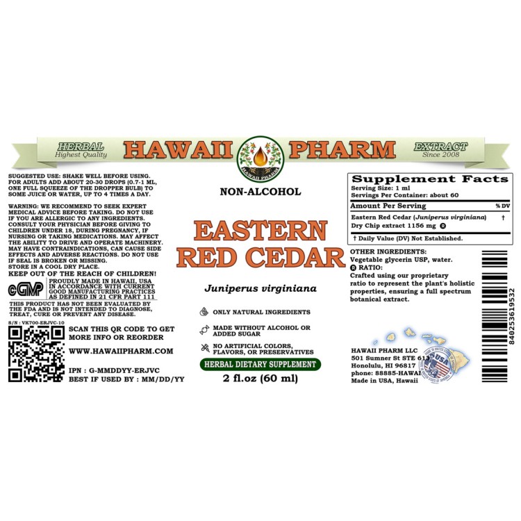 Main ingredient: Eastern Red Cedar (Juniperus virginiana) Dry Chip. Origin: Canada. Menstruum: Alcohol, vegetable glycerin, crystal clear water. Contains NO: GMO, gluten, artificial colors.