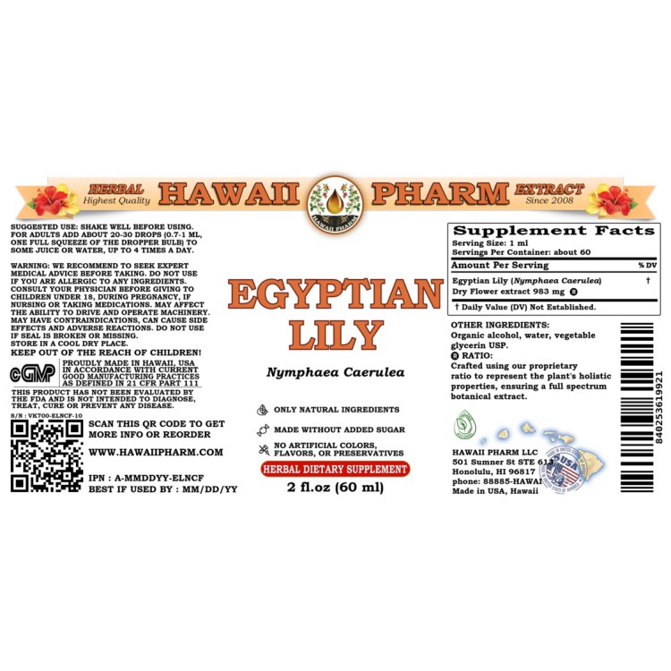 Main ingredient: Wildcrafted Egyptian Lily (Nymphaea Caerulea) Dry Flower. Origin: Thailand. Menstruum: Alcohol, vegetable glycerin, crystal clear water. Contains NO: GMO, gluten, artificial colors.