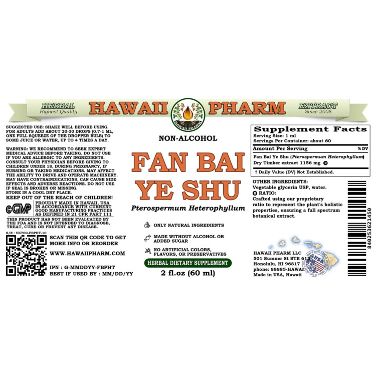 Fan Bai Ye Shu (Pterospermum Heterophyllum) Glycerite, Dried Timber Alcohol-Free Liquid Extract, Glycerite Herbal Supplement