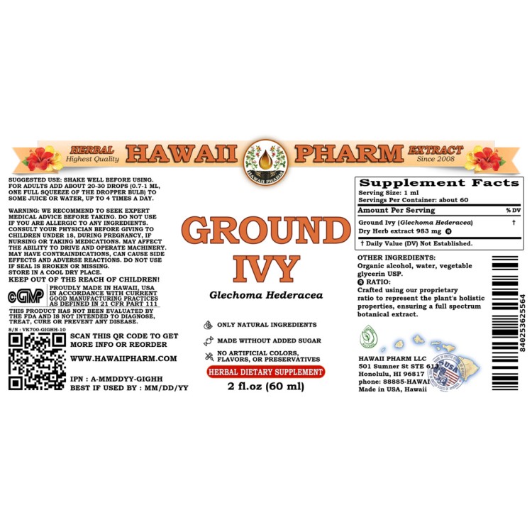 Main ingredient: Ground Ivy (Glechoma Hederacea) Dry Herb. Origin: USA. Menstruum: Alcohol, vegetable glycerin, crystal clear water. Contains NO: GMO, gluten, artificial colors.