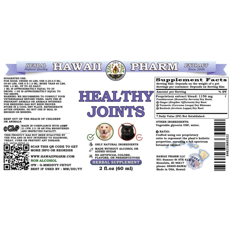 - Healthy Joints Pet Herbal Supplement is 100% drug-free and non-addictive natural Glycerin based liquid formula proudly manufactured in the USA, Hawaii to ensure highest quality of the product!