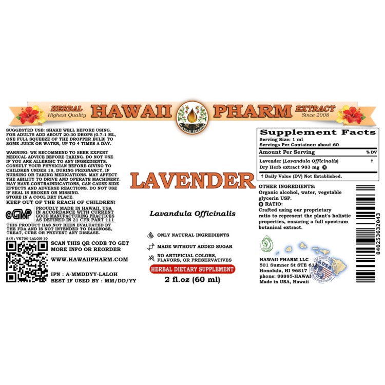 Main ingredient: Lavender (Lavandula Officinalis) Dry Herb. Origin: France. Menstruum: Alcohol, vegetable glycerin, crystal clear water. Contains NO: GMO, gluten, artificial colors.