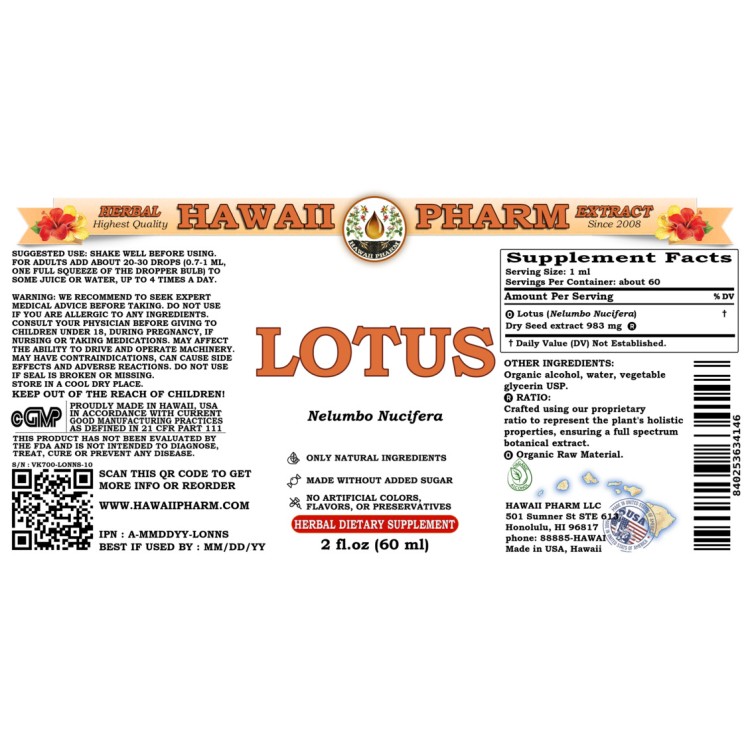 Main ingredient: Certified Organic Lotus (Nelumbo Nucifera) Dry Seed. Origin: India. Menstruum: Alcohol, vegetable glycerin, crystal clear water. Contains NO: GMO, gluten, artificial colors.