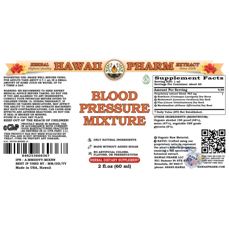 Blood Pressure Mixture Liquid Extract, Hawthorn berry, Motherwort herb, Marshmallow leaf, Flax seed Tincture Herbal Supplement