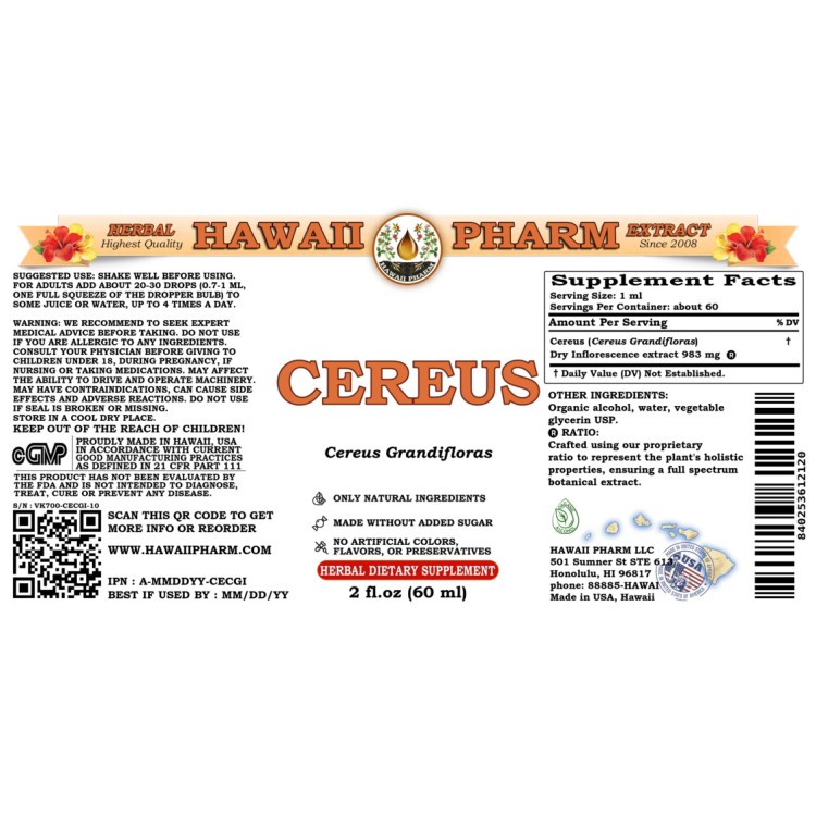 Main ingredient: Night Blooming Cereus (Cereus Grandifloras) Dry Inflorescence. Menstruum: Alcohol, vegetable glycerin, crystal clear water. Contains NO: GMO, gluten, artificial colors, heavy metals, preservatives, pesticides, fertilizers.