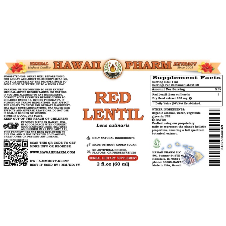 Main ingredient: Red Lentil (Lens culinaris) Dry Seed. Menstruum: Alcohol, vegetable glycerin, crystal clear water. Contains NO: GMO, gluten, artificial colors.