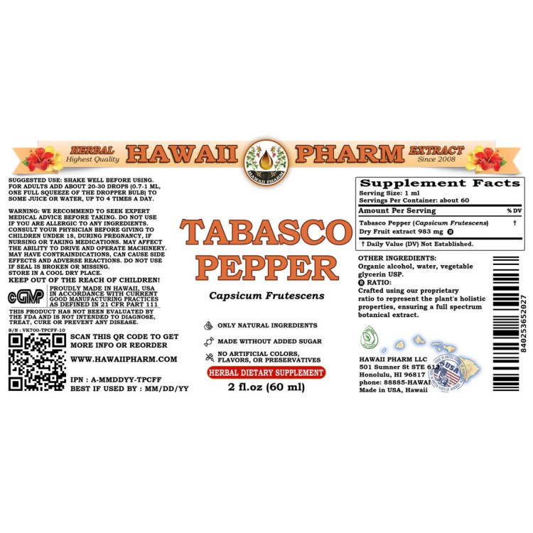 Main ingredient: Tabasco Pepper (Capsicum Frutescens) Dry Fruit. Origin: India. Menstruum: Alcohol, vegetable glycerin, crystal clear water. Contains NO: GMO, gluten, artificial colors.