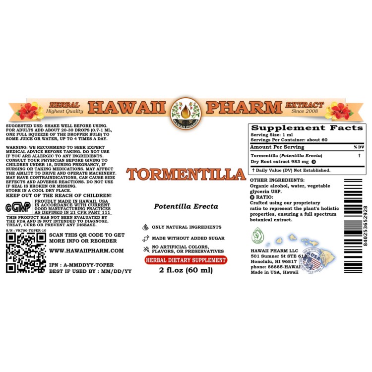 Main ingredient: Wildcrafted Tormentilla (Potentilla Erecta) Dry Root. Origin: USA. Menstruum: Alcohol, vegetable glycerin, crystal clear water. Contains NO: GMO, gluten, artificial colors.