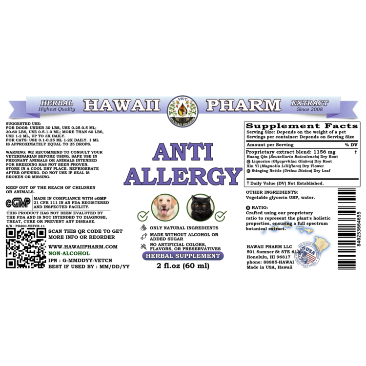 - Anti Allergy Pet Herbal Supplement is 100% drug-free and non-addictive natural Glycerin based liquid formula proudly manufactured in the USA, Hawaii to ensure highest quality of the product!