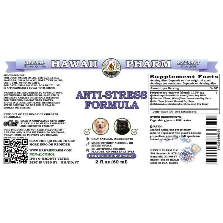 - Anti-Stress Formula Pet Herbal Supplement is 100% drug-free and non-addictive natural Glycerin based liquid formula proudly manufactured in the USA, Hawaii to ensure highest quality of the product!