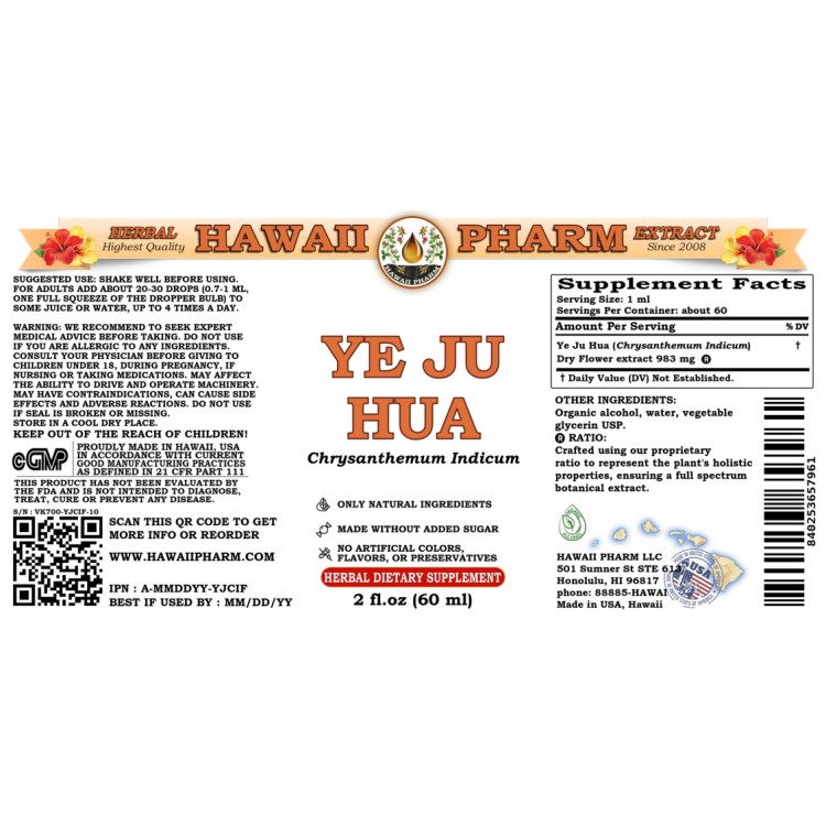 Main ingredient: Ye Ju Hua (Chrysanthemum Indicum) Dry Flower. Origin: Thailand. Menstruum: Alcohol, vegetable glycerin, crystal clear water. Contains NO: GMO, gluten, artificial colors.