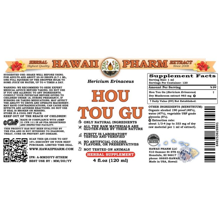 Main ingredient: Hou Tou Gu (Hericium Erinaceus) Dry Mushroom. Menstruum: Alcohol, vegetable glycerin, crystal clear water. Contains NO: GMO, gluten, artificial colors, heavy metals, preservatives, pesticides, fertilizers.
